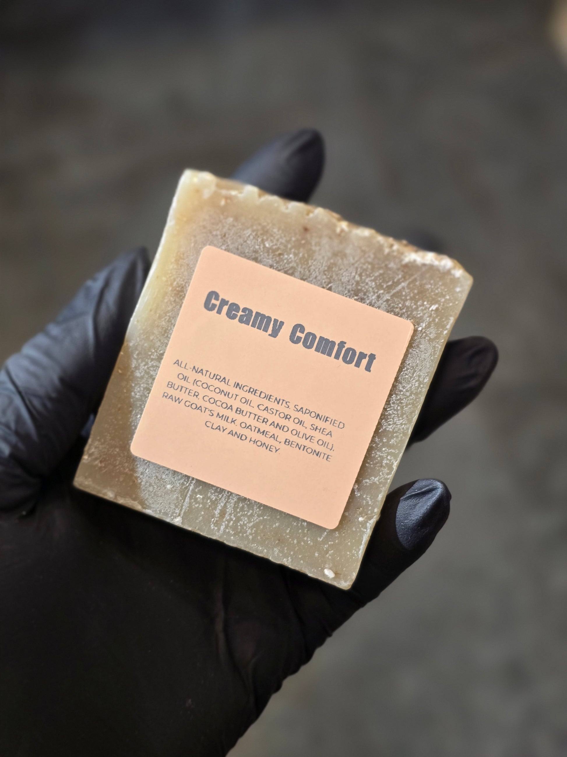 Made with All Natural Ingredients: Saponified Oil (Coconut oil, castor oil, olive oil, shea butter, and cocoa butter) raw goat milk, oatmeal, bentonite clay and honey.